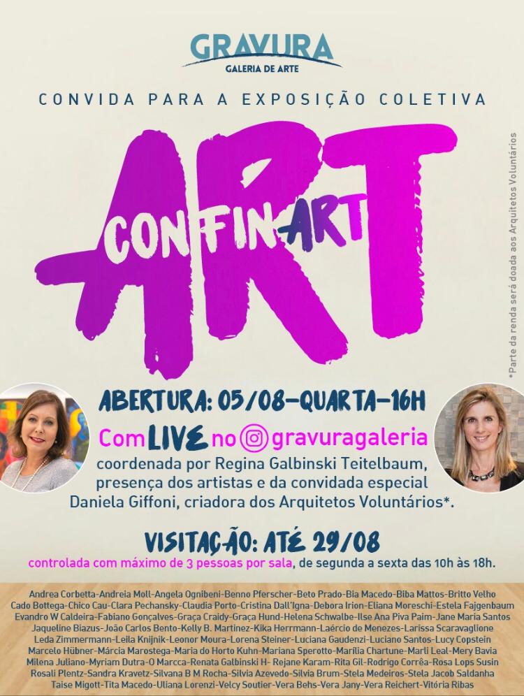 Como o momento ainda exige muitos cuidados, não será realizado um evento físico para evitar aglomerações. A abertura da ConfinArt será através de uma live no dia 05 de agosto, às 16 horas, com coordenação da diretora Regina Galbinski Teitelbaum, participação dos artistas e da criadora dos Arquitetos Voluntários, a arquiteta Daniela Giffoni, ficando aberta à visitação com número controlado de visitantes.